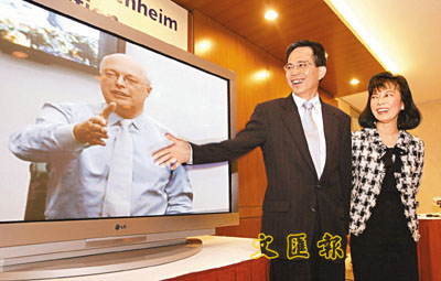 長實副主席李澤鉅與古根海姆基金會董事長Thomas Krens宣佈達成合作協議後「越洋」握手。(張立新 攝)