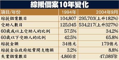 ¡@¤å¥ó«ü¥X¡AºI¦Ü2004¦~9¤ë¡Aºî´©Ó®×ªºÁ`¼Æ¹F295,703©v¡A¤ñ1994¦~¼W¥[¬ù182%¡A¥§¡¨C¦~¼W¥[12%¡C60·³©Î¥H¤W¨ü§U¤Hªº¤ñ¨Ò¡A¥Ñ1994¦~ªº57.5%¤U°¦Ü2004¦~ªº34.2%¡C60·³¥H¤U¨ü§U¤Hªº¤ñ¨Ò¡A«h¥Ñ42.5%¤W¤É¦Ü65.8%¡A·í¤¤15¦Ü59·³ªº¨ü§U¤H¦ûºî´©¨ü§U¤HÁ`¼Æªº42.9%¡Cºî´©ª÷ÃB«h¦³94/95¦~«×ªº34»õ¤¸¼W¦Ü¤µÓ°]¬F¦~«×ªº179»õ¤¸¡]¨£ªí¡^¡C
