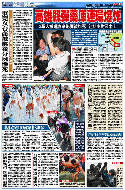 【本報訊】據東森新聞6日消息:台灣高雄縣旗山聯勤彈藥庫6日下午2時50分左右發生爆炸意外,3名在現場作業的軍人不幸死亡。意外發生的原因初步鑑定是由於這3名官兵在進行57高砲的搬運工作時,不小心讓砲彈碰撞到門邊,因此引發一連串的大爆炸,不過確切的原因還需要專業人士進一步鑑定。