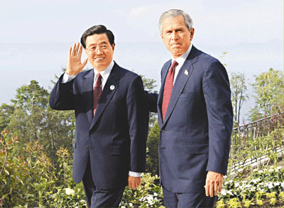 胡錦濤與布什將於本月在智利舉行的亞太經合組織領導人非正式會議期間會晤。圖為兩人去年6月見面時的情形。(資料圖片)
