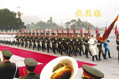 據新京報報道,中國人民解放軍陸海空三軍儀仗隊8日透露,今冬三軍儀仗隊徵集的200多名新兵將在山東、山西、河北、河南、江蘇、遼寧6個省嚴格選出。圖為9月底解放軍三軍儀仗隊在北京人民大會堂東門外廣場在執行一項外事檢閱任務。 (中新社)