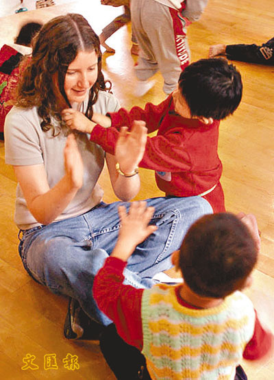 圖為愛爾蘭籍女學生與孤殘兒童愉快地做遊戲。 (楊婀娜 攝)