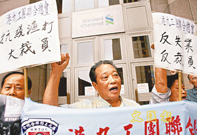 勞工團體昨到渣打銀行總部請願,並要求渣打收回裁員決定。 (法新社)