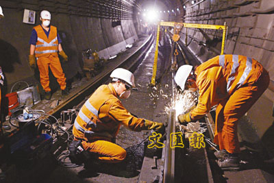 地鐵路軌一般壽命10年,但轉彎處受壓大,壽命會縮短。圖為地鐵施工時狀況。(資料圖片)
