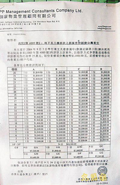 住戶支付訴訟費紀錄表。(蔣焯文 攝)