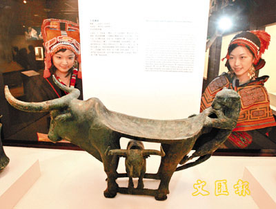 「國寶級」文物「牛虎銅案」,屬戰國時代文物,在1972年於雲南省江川縣李家山24號墓出土。全器由二牛一虎組成,主體為一立牛,造型穩重,雙角前指,頸項豐隆,鼻寫真細膩。牛背擴展呈橢圓形案面,尾部上翹,一虎噬牛尾,前爪攀扶案緣,躬身下垂,後腿蹬附牛體,形如案耳。主體立牛背部案免以下鏤空,牛足間鑄連橫檔,前後兩橫檔上,鑄立一頭形狀相同而尺寸與此空間相容的立牛,橫出大牛腹下。