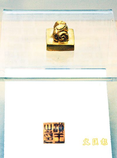 原滇王金印在雲南普寧石寨山6號墓出土,呈方形,配有蛇鈕,蛇背上飾有鱗片紋,邊長2.3厘米,高1.8厘米,重89.5克,印鈕與印身分開鑄成,篆文「滇王之印」為鑿製。據<<史記.西南夷列>>記載,漢武帝元封二年(公元前109年)滇王降漢,武帝雖在此設益州郡,但仍賜以滇王之印,令他繼續管治其民眾。