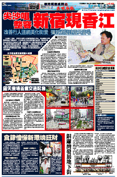 【本報訊】(記者 翁育紅)本港兩大旅遊旺區即將大變身,政府繼提出在銅鑼灣興建地下購物街後,今日將詳細公布尖沙咀市區改善計劃,期望將該區變身為更具活力的都會中心區,擁有完善的行人通道網和優美的街道景觀,東西部的聯繫也更為緊密。規劃署表示,如諮詢文件順利通過,三個街景改善試點項目最快於明年完成,至於重頭發展項目——仿效東京新宿的彌敦道露天廣場,則需待09年九鐵南環線落成後才詳細規劃。