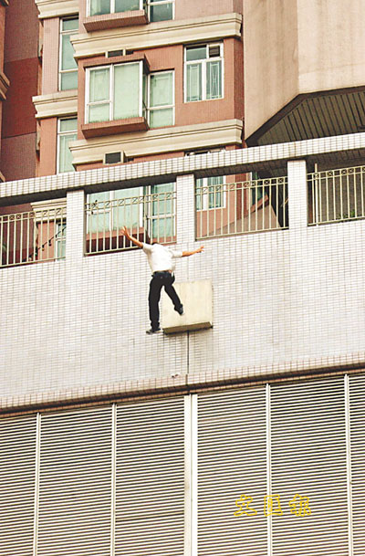 昨午4時許,劉突登上荃灣警署附近美環街愉景新城第3期9座對開平台,攀越欄河危站在平台外牆一條僅4至5吋闊的石 上,背向街外企圖跳樓,被屋苑護衛員發現報警。