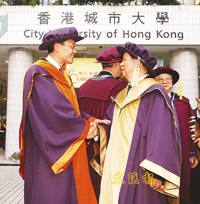 蕭揚獲城大頒博士學位,吳光正與他互相祝賀。(劉國權 攝)