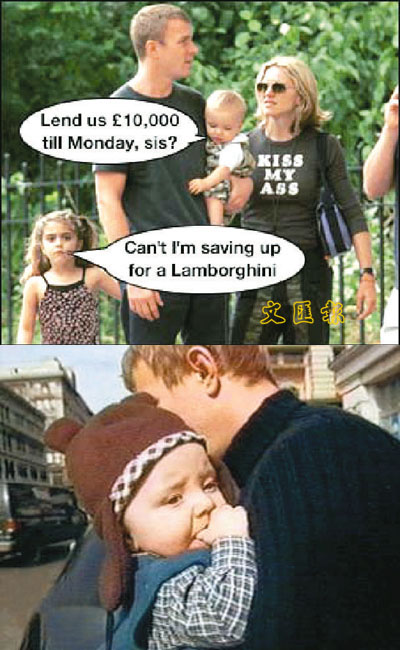 麥當娜幼子(上圖手抱者及下圖)在鬼馬的設計對白中,向姐姐借1萬鎊,被正蓄錢買林寶堅尼的姐姐拒絕。