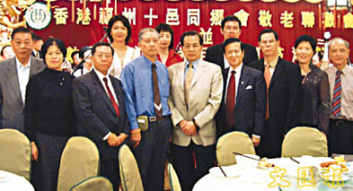 香港福州十邑同鄉會負責人朱正、鄭重、林明海等在敬老聯歡中合影。(趙威 攝)