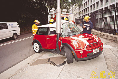 【本報訊】一輛新版「MiniCooper」,昨午由女司機駕駛途經下亞厘畢道中區政府總部對開時,失事撞向燈柱,「谷巴仔」全車摺曲,女司機受傷一度被困,事後由消防員救出送院。