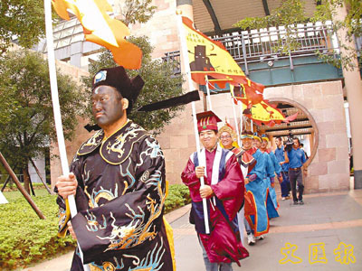 板橋地檢署宣導反賄選,14日下午由法警扮演包青天,在街道遊行,宣導乾淨選舉。(中央社)