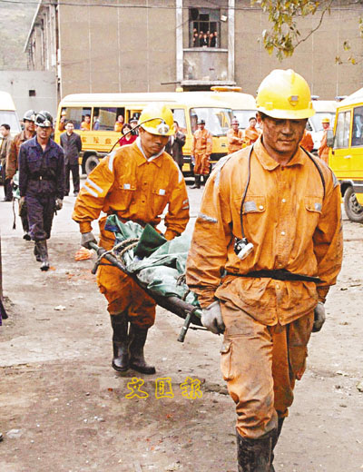 10月20日,鄭煤集團大平煤礦發生瓦斯爆炸事故,事故造成148名礦工遇難、32人受傷。圖為救護隊員將遇難者遺體抬出礦井。 (資料圖片)