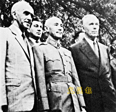 左起:司徒雷登、蔣介石、馬歇爾。 (資料圖片)