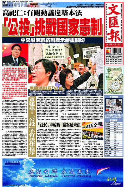與此同時,香港特區行政長官董建華昨天再次重申,個別議員提出的「公投動議」,不符合既定法律程序,也不切實際和誤導市民,特區政府絕不會考慮任何背離《基本法》及全國人大決定去處理兩個選舉辦法的提議,亦反對包括公投在內的任何背離《基本法》及全國人大決定去處理兩個選舉辦法的做法。