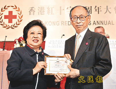 【本報訊】(記者 葉傲冬)香港紅十字會昨日假會展中心舉行周年大會,該會會長、特首夫人董趙洪娉主持獎章及獎狀的頒授儀式,其中,主席楊鐵樑爵士更獲頒發15年服務獎,以表揚他對紅十字會多年的貢獻。另外,以聖誕錄音小熊為主題的「愛心相連」籌款活動,昨日亦一併舉行。