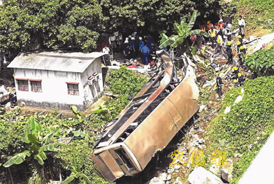 兩車相撞後續前行一小段路,巴士衝力最後把拖頭由向左20度撞回右方,巴士則被迫由左線被撞向路肩,撞毀10.35米長防撞欄,巴士前輪胎衝出公路懸空兩、三秒後終由車頭一縱而下,直墮30米下橋下山崖,19名乘客及司機當場死亡,另有兩人稍後亦告不治。