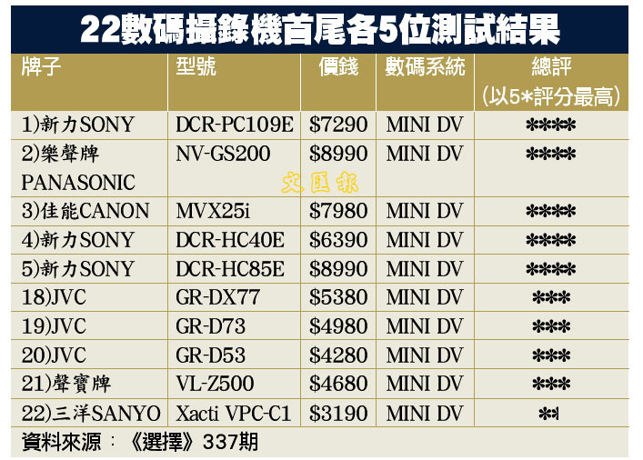 22數碼攝錄機首尾各5位測試結果 (圖)