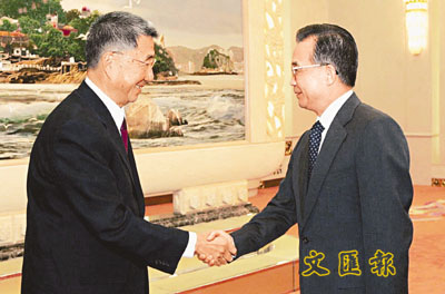 溫家寶(右)與諾貝爾物理學獎得獎者丁肇中親切握手。 (新華社)