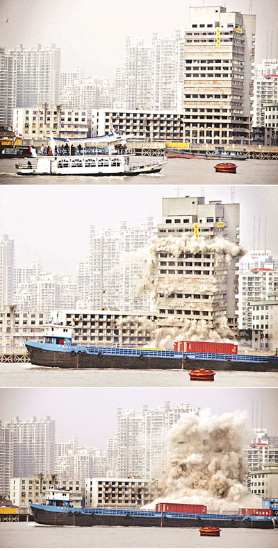 17日下午,上海港高陽港務公司的19層中心大樓被成功爆破,施工單位採取「減震墊」和「減震溝」等方法確保距大樓不足百米的黃浦江防汛牆安然無恙。由上至下為大樓爆破的過程。 (新華社)