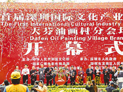 首屆深圳國際文化產業博覽會昨日在深圳高交會館開幕。有「中國油畫第一村」之稱的大芬村,其分會會場亦已於17日在龍崗區大芬村開幕。大芬村展會上節目琳琅滿目,包括千名畫工創作油畫表演、油畫精品拍賣會、大宗油畫經銷合同簽約儀式等。