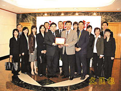 富城集團趙伯琛董事(左七)、梁偉成高級集團經理(左六)、朱仲玲高級集團經理(左五)、胡澤權集團經理(右八)等集團高層及多位員工蒞臨本報參觀並致送紀念品,由本報廣告部第一副總經理張錦川代為接收。