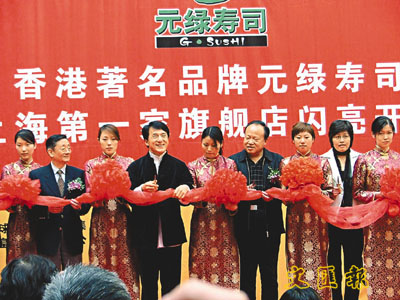 成龍及楊受成為元綠壽司店剪綵。 (本報上海傳真)
