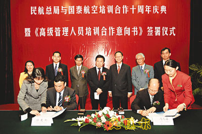 【本報訊】(記者 鄭群)中國民用航空總局和國泰航空公司日前在北京簽署了《高級管理人員培訓合作意向書》,同時慶祝雙方合作舉辦的《中級管理人員培訓計劃》實施10周年。國泰航空董事兼常務總裁陳南祿認為,中國在持續經濟的強勁發展下,航空業的前景實無可限量。