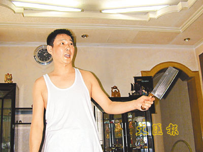 張向記者展示其以防不測的菜刀,稱誰敢收樓就以刀對付誰。