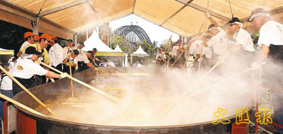 澳洲救援人員和著名廚師昨天在如詩如畫的悉尼海港共襄善舉,合力烹調一碗重量達到7.5公噸的超巨型意式雜燴飯,以期引起更多人關注這個世上還有很多人生活在饑餓當中,極需要大家提出援手。這碗超巨型意式雜燴飯除了可以慶祝聯合國國際米飯年外,還能刷新健力士世界紀錄,成為歷來最重的一碗飯。