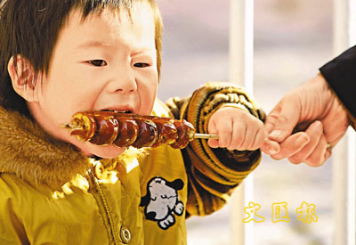 冰糖葫蘆在北京冬日很受歡迎。圖為兒童在街頭吃冰糖葫蘆。 (法新社)