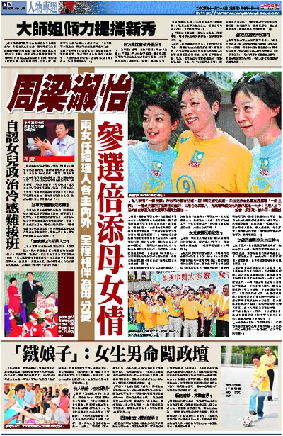 周梁淑怡打直選戰時,兩位「寶貝女」經常相伴左右打氣,現時周太成功躋身立法會,乖女亦「功成身退」。那麼,周太有否考慮培養她們成為政壇新秀?周太聽後哈哈大笑,大讚女兒的確有不俗的從政條件,卻又感嘆:「女大女世界」,做媽咪的,也難以為女兒設計人生道路。她說,其實自己心中有數,兩位乖女對政治的興趣不大,加上不認同香港政制,實在難打她們的主意,政壇接班人相信要另覓人選了。