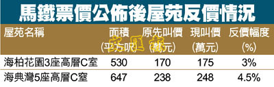 然而消息公佈後,仍有少量業主輕微將售價上調3%至5%。以馬鞍山中心為例,馬鐵票價公佈後,業主隨即反價3%,該單位為馬鞍山中心4座中層D室,單位面積848呎,業主原先開價270萬元,現開價280萬元,輕微上調3%。