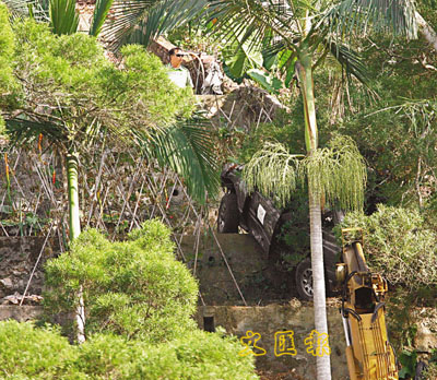 【本報訊】大埔嘉道理農場昨晨發生奪命車禍,農場一名動物保育主任駕駛四驅車上山工作時,汽車在上斜的「U」形彎位失控墜下30米山坡;保育主任被拋出車外,當場重傷昏迷,被消防員救起後證實身亡。猶幸墮山四驅車被大樹擋住跌勢,不致直墮坡下,在坡下工作的幾名工人有驚無險。