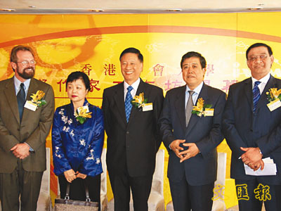 楊文昌特派員(右二)出席浸大「國際作家工作坊」開幕禮時與吳清輝校長(中)和鍾玲教授(左二)等合影。