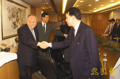 行政長官會晤多個專業團體代表,為施政報告進行諮詢,圖為董建華與香港大律師公會主席陳景生握手,旁為香港專業聯盟主席梁振英(左二)。