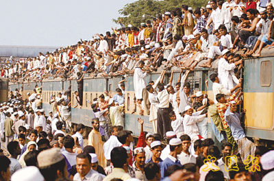 孟加拉首都達卡舉行為期3天的回教聚會,在聚會結束當日,火車接載大量信眾出席盛會,來自不同國家、近200萬回教徒將會出席壓軸日的禱告。(路透社)