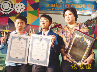 此外,本年度最年輕的得獎者鄭興偉、丘子遨,今年5月成功協助警方捉拿「偷手機賊」而獲好市民獎。當日他們與朋友打籃球之際,發現一名青少年偷去其朋友的手提電話,便立即展開追截。鄭恐防賊人逃脫,於是立刻報警,並成功協助警方拘捕疑犯。鄭、丘二人今年12歲,年紀輕輕卻甚有正義感。「即使被偷去電話的不是我們的朋友,我們都一樣會追。」警察公共關係科每年都會分2期頒發好市民獎,表揚他們的英勇行為。昨日為今年第2期頒獎禮,有40名市民獲獎。警務處行動處長任達榮昨在頒獎禮上致辭時表示,警方獲得市民協助,可以更有效破案,將不法之徒繩之於法。