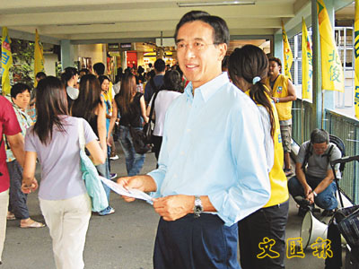 富家子出身的田北俊,在沒競爭下當選立法會滅貧委員會副主席,為窮人請命。圖為競選當日,田少一身便服落區拉票。(資料圖片)