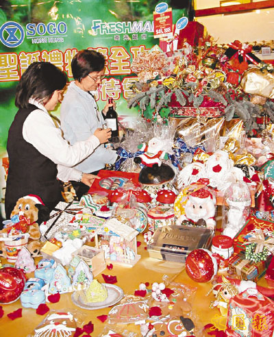 內地聖誕用品出口主要面向美歐及香港。圖為港銅鑼灣一家大型商場的職員在精心擺放聖誕禮品。(新華社)