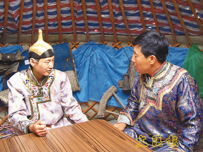 蒙古青年希拉巴日(左)與相撲手在對歌。
