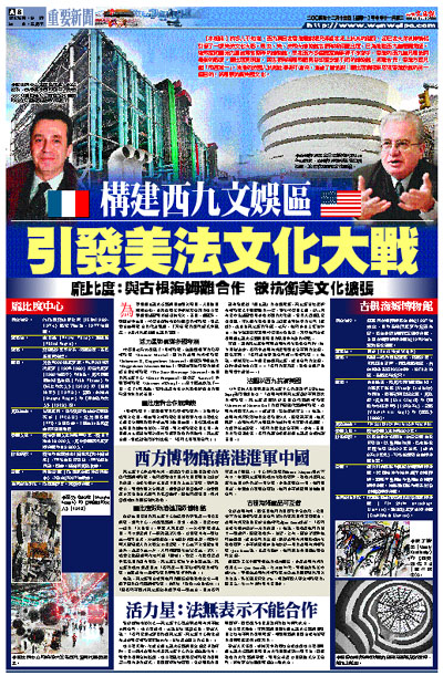 【本報訊】許多人不知道,西九項目在香港雖說還只停留在紙上談兵的階段,卻已在大洋彼岸悄然引發了一場美法文化大戰。原來,美、法兩大博物館古根海姆和龐比度,已為進駐西九龍展開角逐。這兩家同屬活力星策略性夥伴的博物館,早在西方多個國家競爭得不亦樂乎,香港的西九龍只是他們最新的戰場。龐比度更明言,與古根海姆是兩間風格和理念都不同的博物館,很難合作,香港方面只能「兩選其一」。浪漫的法國人談起此事絕不言笑,直截了當地說:龐比度積極爭取在香港設館的另一個目的,就是要抗衡美國文化。