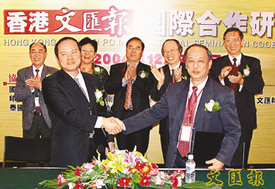 文匯報副總編輯劉偉忠與緬甸華報社長趙業華在文匯報國際合作研討會上簽署合作協定。文匯報副社長潘一黎、總編輯王伯遙、副總經理張新峰、趙業華夫人等見證了簽字儀式。 (張萍 攝)