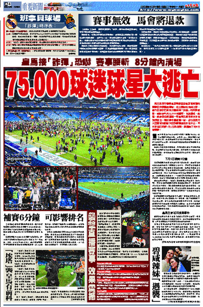 周日西班牙聯賽皇家馬德里對皇家蘇斯達的賽事因炸彈驚魂腰斬,在比賽將近完結之際,警方因接到巴斯克分離組織「埃塔」的炸彈威脅,疏散場內約75,000名觀眾,包括碧咸、奧雲、朗拿度和費高等一眾皇馬王牌球員亦被迫狼狽逃生。雖然事件屬虛驚一場,卻令西班牙大型體育活動首次因恐襲驚魂而被迫中止,兩支球隊已同意1月5日再碰頭,續踢餘下的6分鐘賽事。