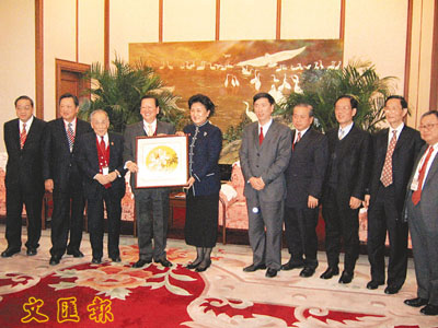 劉延東高度肯定僑聯的貢獻,她雖然忙於公務,但也特別與訪京團會面,更設宴招待成員。圖中為僑聯會長陳有慶致送紀念品予劉部長。 (曾少妍 攝)