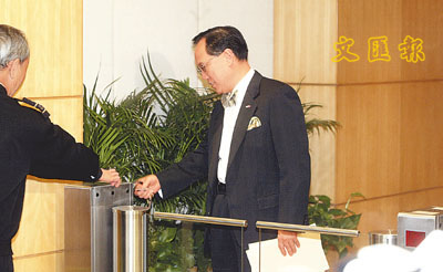 曾蔭權出入政府總部的門閘時出現問題,要勞煩保安「救駕」。 (劉國權 攝)