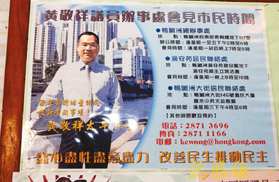 黃敬祥區議員的宣傳海報。(蔣焯文 攝)
