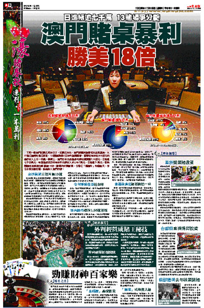 下周一是澳門回歸五周年日子。回歸五年來,澳門憑開放賭權迎來投資高潮,大小過江龍趕赴濠江搶灘,13間賭場將於五年內陸續開業,誓要在每年近300億元的博彩收入上分一杯羹。事實上,澳門去年來自賭桌的淨收總額達270億元,日進帳七千多萬元;每張賭桌派彩後每年平均淨收入約7,692萬元,日進帳21萬元;較美國賭城拉斯維加斯高逾18倍。豐厚的利潤前景,令香江「濠賭股」炒個翻天,亦令外資如蟻附羶,蜂擁殺入澳門市場。